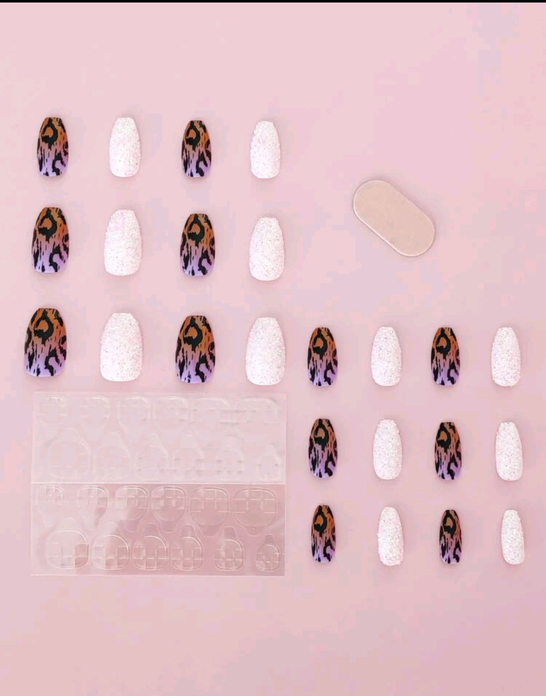 24 nails, nail stickers & File glue is recommended for longer wear